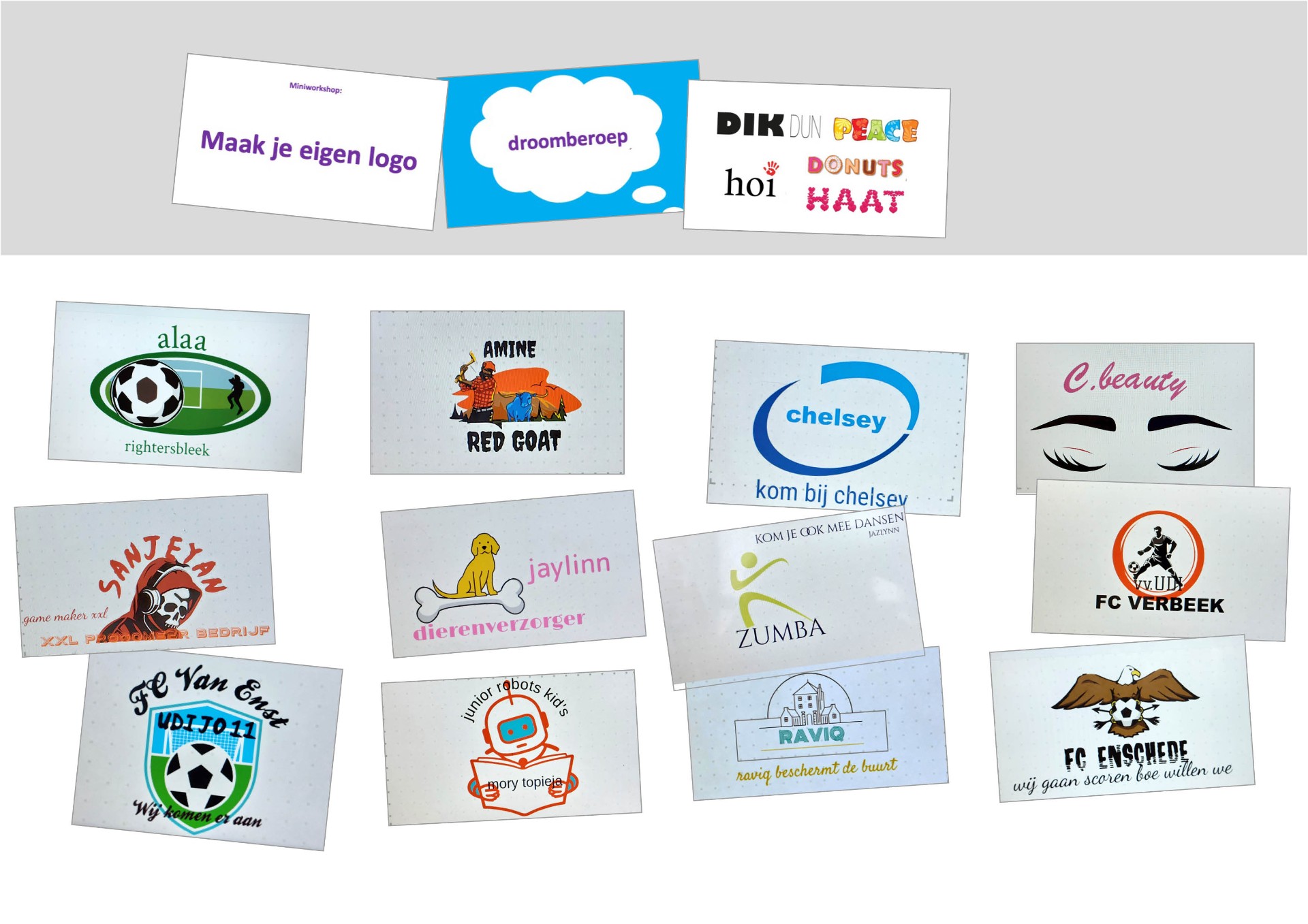 Het eerste thema was de kennismaking met het beroep grafisch vormgever. Als coach met kunstacademie als achtergrond heb ik deze les zelf gegeven. De leerlingen hebben ervaren dat lettertypes en kleuren best veel uitmaken voor de uitstraling van een logo. Ze hebben eerst nagedacht over wat ze later willen worden en daarna kregen ze de opdracht om een logo samen te stellen voor hun eigen toekomstige zaak. Deze hebben ze digitaal gerealiseerd met een makkelijk online programma! Leuk om de verschillende interesses en stijlen te zien en een enkeling vond het zo leuk dat dat wellicht een nieuwe beroepswens kon worden.