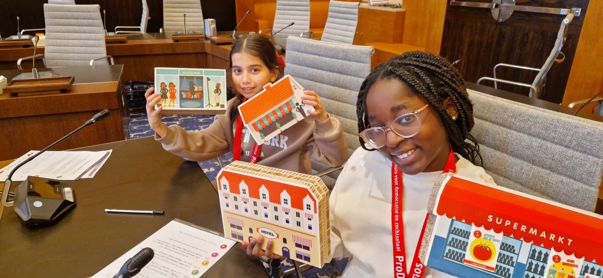 Vandaag zijn we met groep 7 naar het stadhuis in Enschede geweest. We hebben daar het democracity spel gespeeld. We mochten zelf onze eigen politieke partij oprichten en aangeven wat we belangrijk vinden in een stad. Willen we een kerk, een moskee of een supermarkt? Of toch liever een dierentuin? Door te stemmen kwamen we er achter dat bij een meerderheid van stemmen in een democratie het gebouw of het project er kon komen en anders niet!